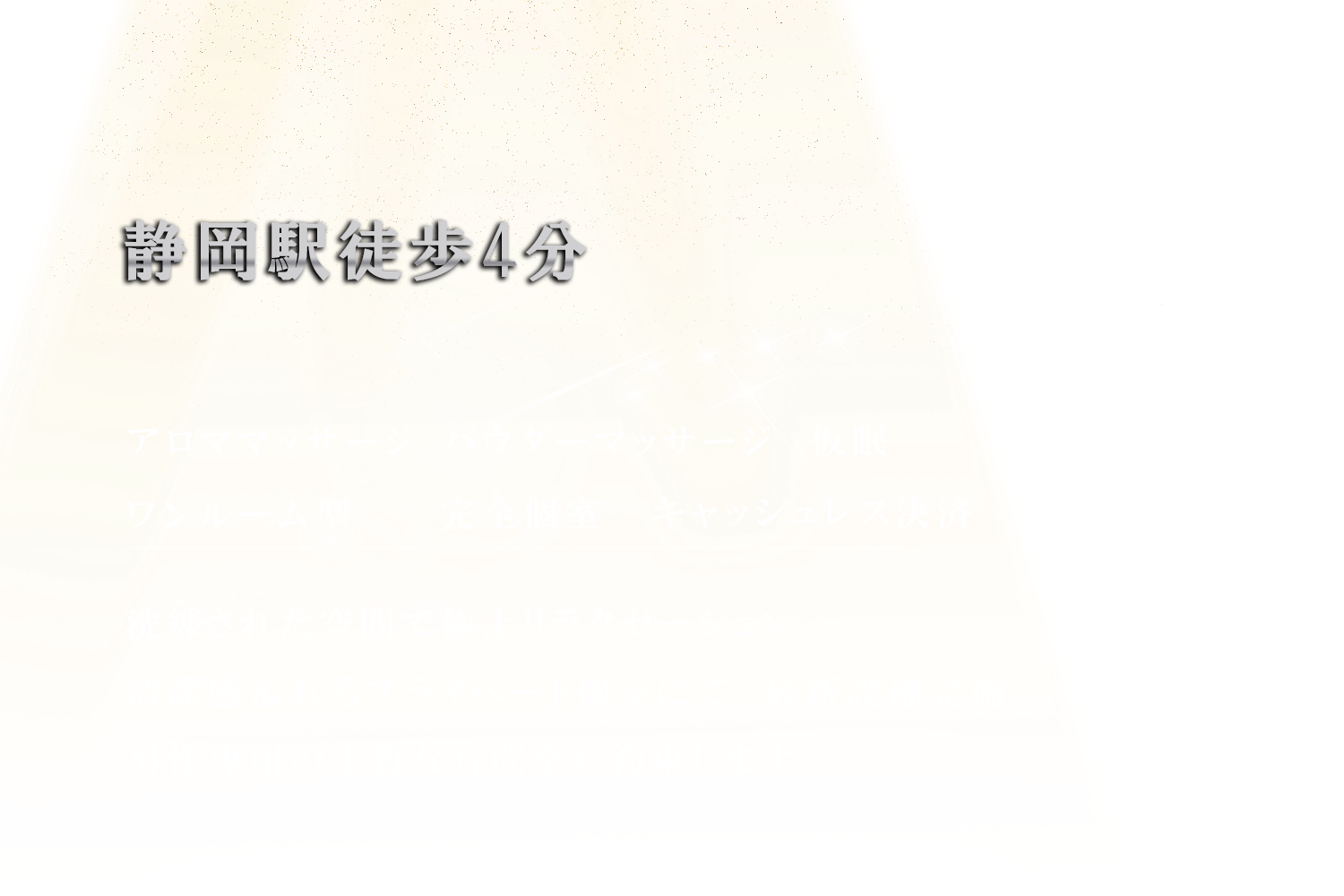 当店では、アロマオイルの効能と当店自慢のセラピストによるリンパマッサージの相乗効果による、癒しのひとときをお客様お一人お一人にお届けしております、自然で心やすらぐ優美な香りを、施術中はもちろんご帰宅お休みになってから翌日朝目覚めでまで楽しんで頂けます、どうぞゆっくりご堪能ください。